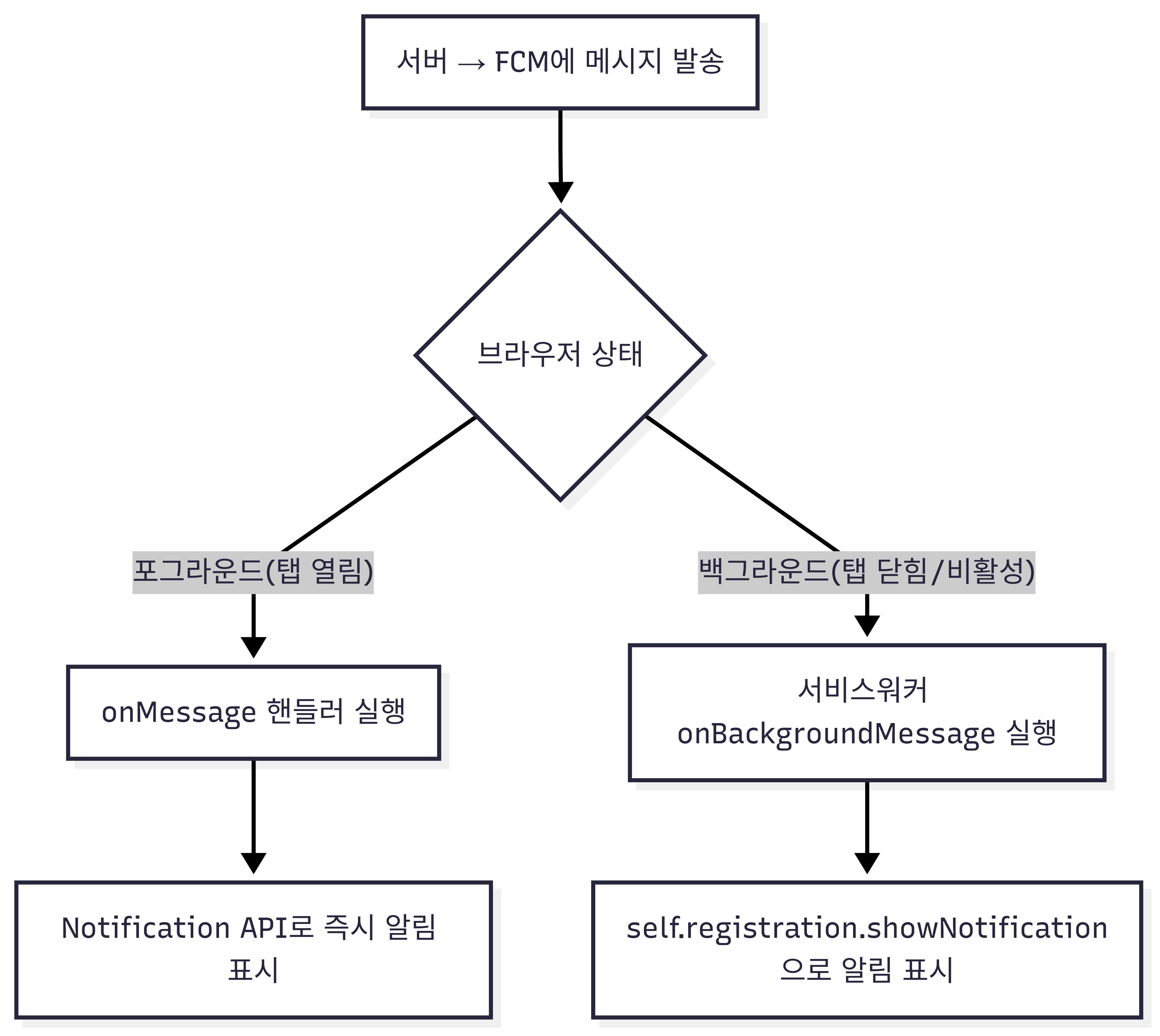 - 만약 브라우저 상태가 포그라운드라면 onMessage , 백그라운드라면 onBackgroundMessage를 실행