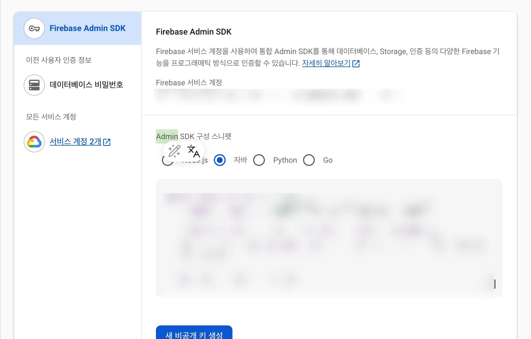 또 서비스 계정키를 생성해야하는데, 밑에있는 새 비공개 키 생성버튼을 누르고 키생성을 클릭합니다. 그러면 서비스 계정 키가 포함된 JSON파일이 다운되는데 여기서 서버에서 FCM을 사용할수있는 인증정보가 담겨있다.