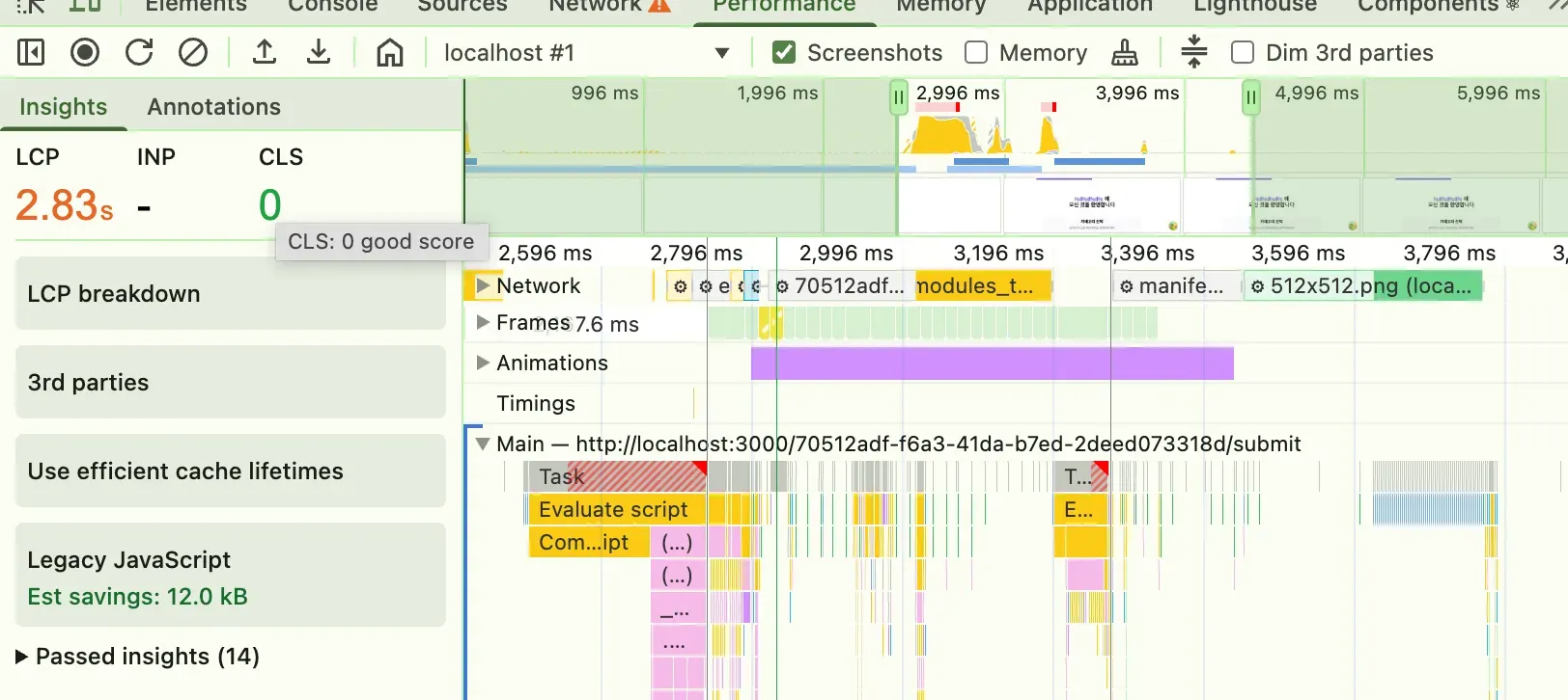 즉, 네트워크 요청 크기나 번들 크기 자체는 점수에 직접 반영되지 않습니다. 파일을 80% 줄여도, 그게 곧바로 LCP나 TBT 개선으로 연결되지 않으면 점수 변화가 없을수밖에 없었던 것이라고 합니다.