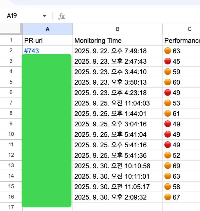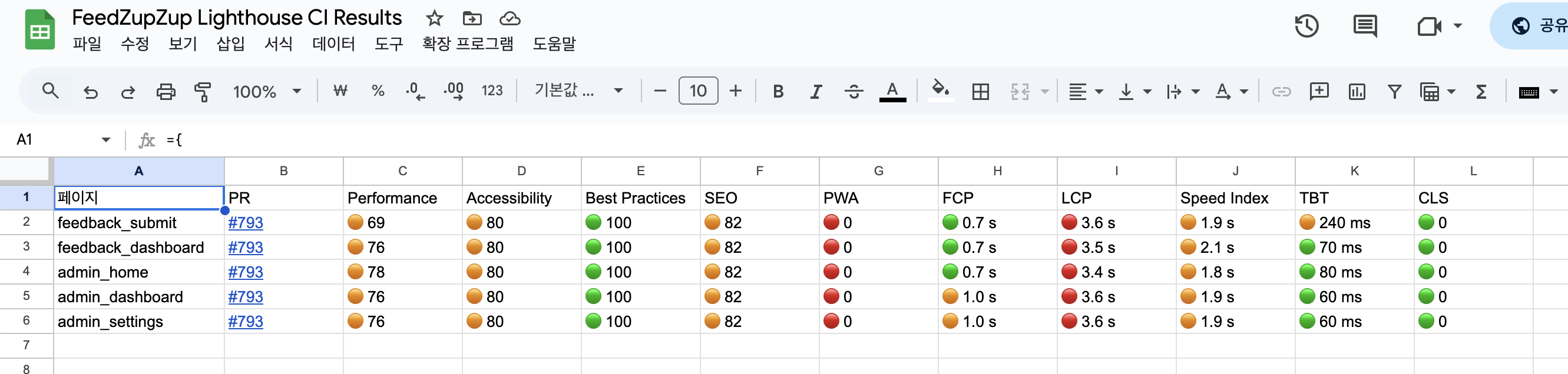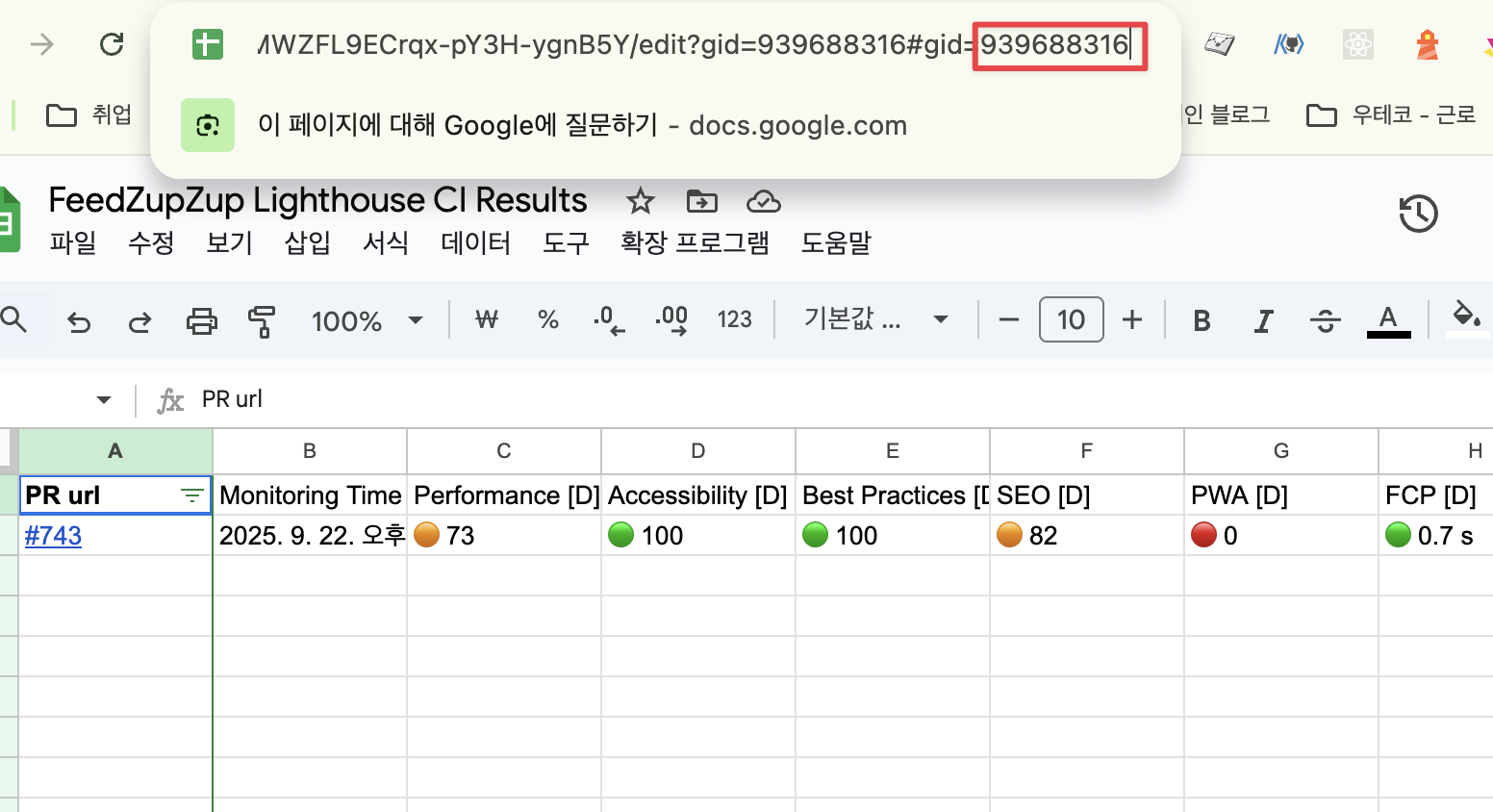 왼쪽과 같이 PR을 올릴때마다 성능을 코멘트로 달고, 오른쪽에 구글시트에도 각 페이지 별로 내용이 담깁니다. (이러면 히스토리도 확인할수있습니다! 어떤 PR이 올라왔을때 어떻게 성능이 변했는지도 확인할수있습니다!! )