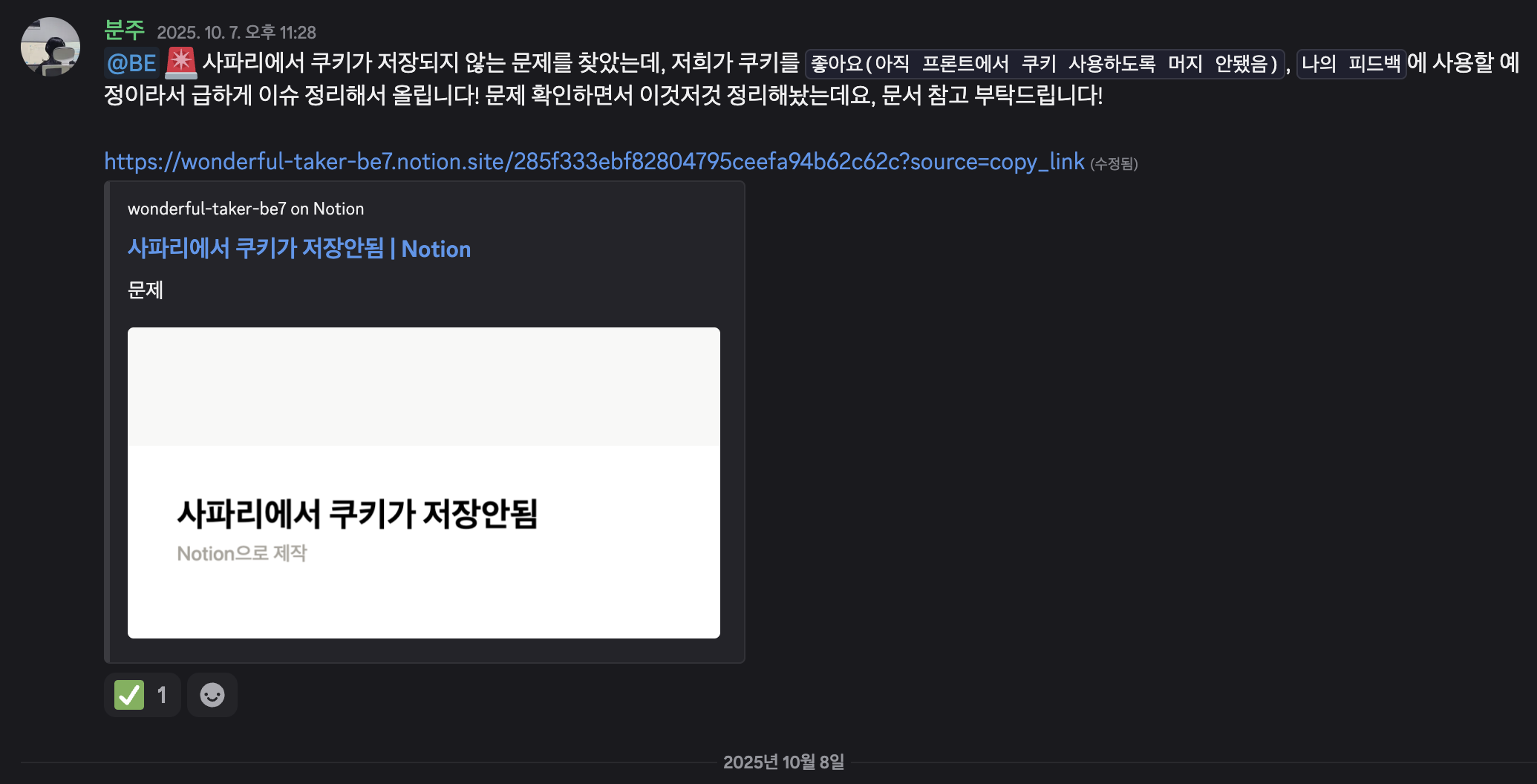 결국 해결책은 단순했습니다. domain 속성을 .example.com으로 지정하는 것만으로 Safari에서도 완벽히 동작하게 되었어요ㅎㅎ 이 경험을 통해 “같은 코드라도 브라우저가 다르면 전혀 다르게 작동할 수 있다”는 걸 다시 한 번 느낀것 같습니다. 위의 내용은 문서로 백엔드분들에게 공유했고, 재빠르게 수정해주셨습니다!
